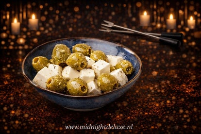 Onze olijven met romige feta vormen een verfijnde balans tussen fris, zacht en hartig. De volle, licht zoute feta omarmt de sappige olijven en zorgt voor een luxueuze smaakbeleving die perfect past bij lange nachten en goed gezelschap. Een stijlvolle klassieker die elke nachtborrel moeiteloos naar een hoger niveau tilt – rijk van smaak, elegant gepresenteerd en onvergetelijk tot de laatste hap.